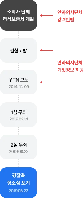 저는 안과의사단체가 제기한 의혹들과 왜곡된 프레임 속에 2년간 13번의 재판을 받았습니다. 13번의 재판이 진행되는 동안 안과의사단체 증인 7명의 날조된 증언 속 안과의사단체의 거짓말을 밝혀내 2019년 2월 14일 1심 재판 무죄, 2019년 8월 22일, 2심 재판 역시 무죄를 받았고, 2심 재판 후 검찰 측에서 더 이상 추가할 반론이 없다며 검찰 측에서 3심 항소심을 스스로 최종 포기했습니다.